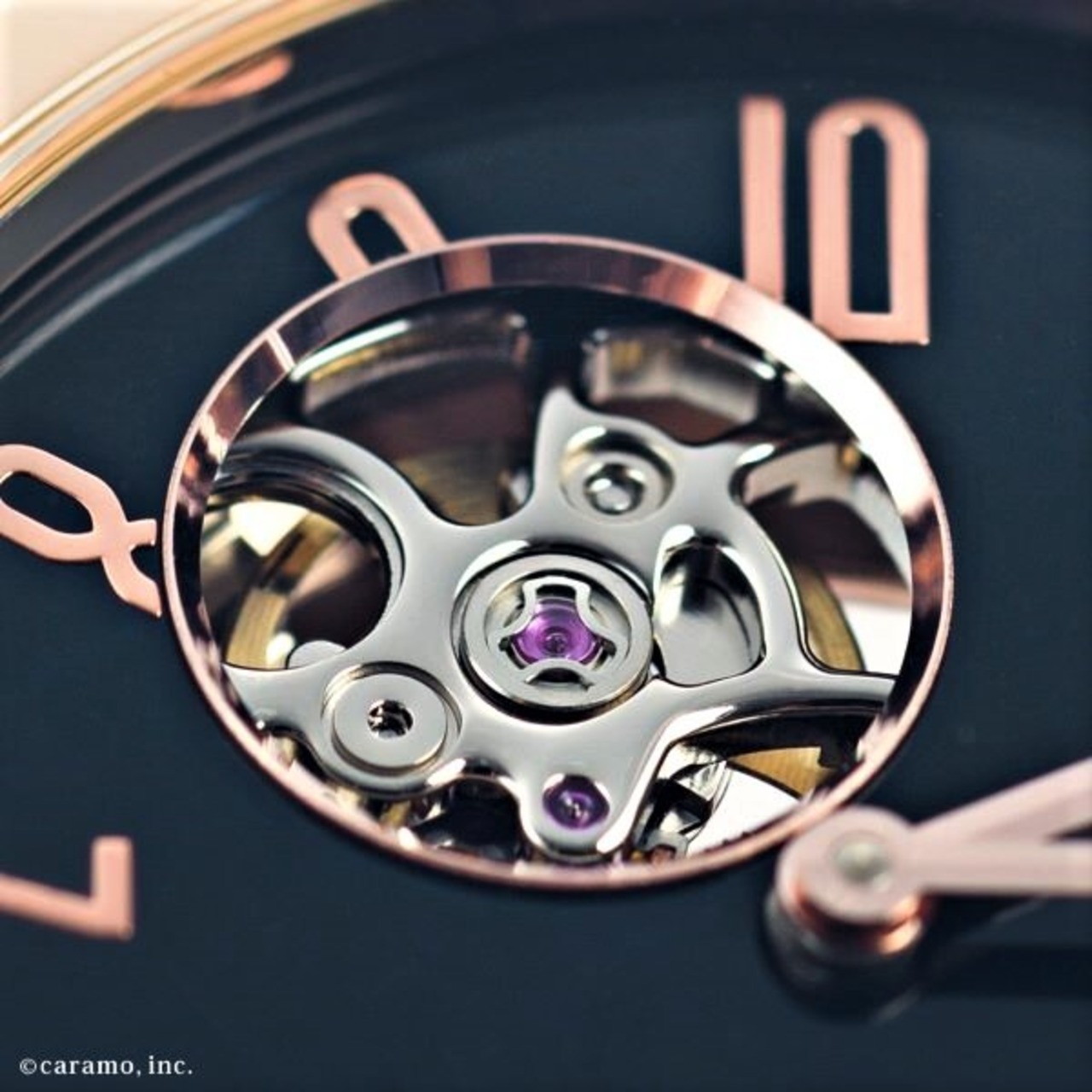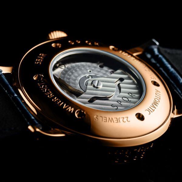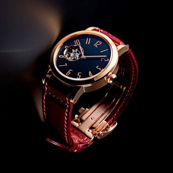 信州・木曽漆の伝統工芸士で長野五輪のメダル制作に携わった荻上 文峰氏による匠の卓越した技法で、2ヶ月の時間を要して文字盤と竜頭が完成します。奥深い藍色文字盤とピンクゴールドのケースの絶妙な色のバランス。9時位置には時計の心臓部「てんぷ」の1秒間に6回の鼓動を、目で楽しむことができる国産機械式ムーブメントを搭載しています。